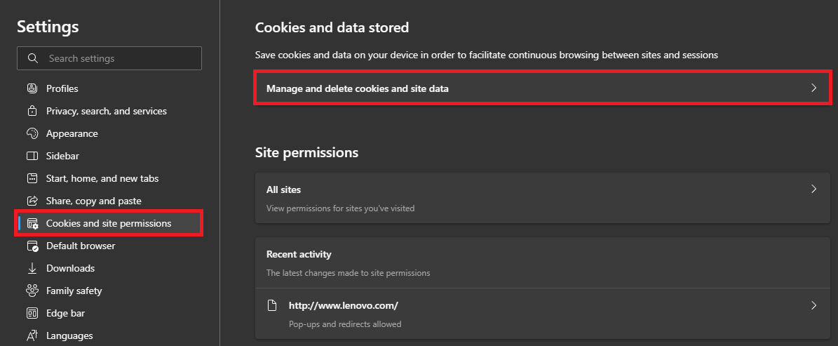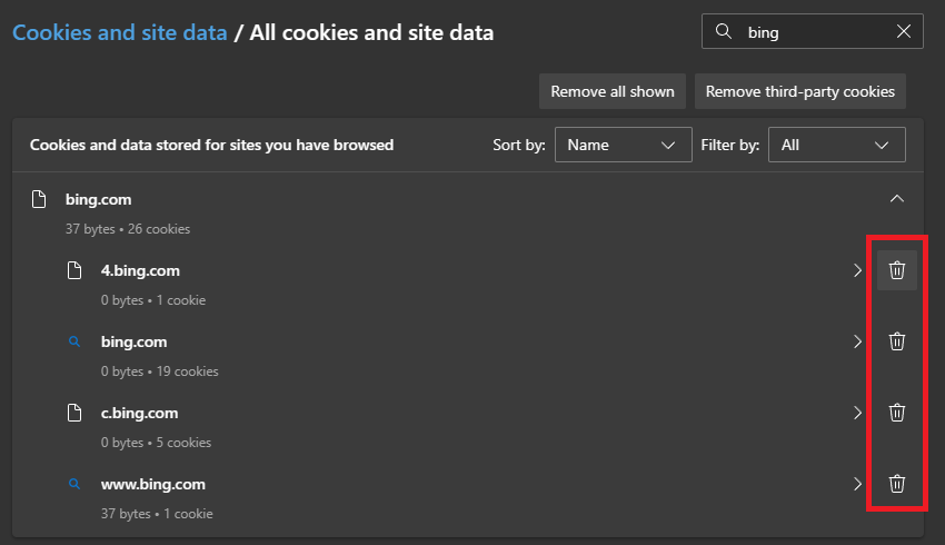 导航至Cookie 和网站权限> 管理和删除 cookie 和站点数据 > 查看所有 cookie 和站点数据。搜索 bing.com 并继续清除 bing.com 域的所有站点 cookie 和数据。