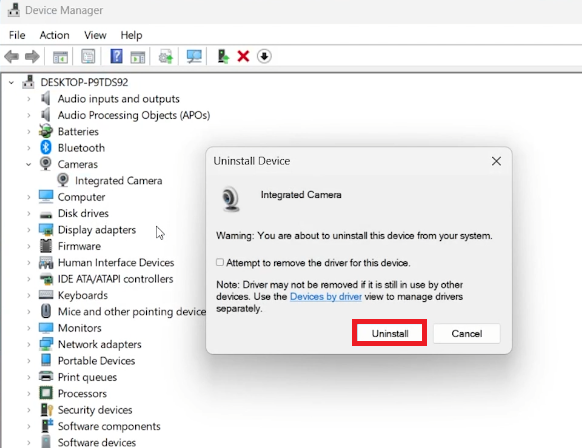 如果您仍在Windows 11 PC上遇到相机问题,则罪魁祸首可能是过时或损坏的相机驱动程序。要刷新它,请打开您的开始菜单并搜索“设备管理器”。在“设备管理器”窗口中,展开“相机”部分。右键单击相机驱动程序,然后选择“卸载设备”。将出现一个弹出窗口;确保将复选框保持不合格,然后单击“卸载”。