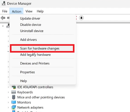 设备管理器中的“扫描硬件更改”选项会检查系统上的任何硬件更改。如果您已经卸载了驱动程序,则选择此选项提示Windows自动重新安装更新的驱动程序。