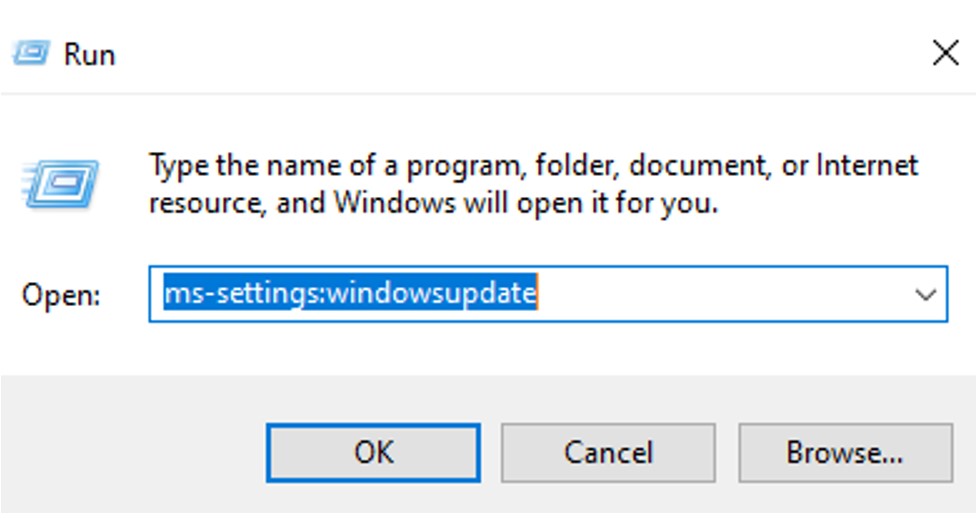 1)按下组合键Windows + R按键盘上的 键启动“运行”对话框。在文本框中输入ms-设置:windowsupdate并点击“进入”键。您也可以单击“开始”菜单并选择“设置,”然后双击“Windows 更新”。