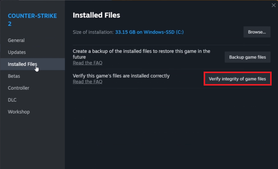 Counter-Strike 2 > 属性 > 安装的文件 > 验证游戏文件的完整性