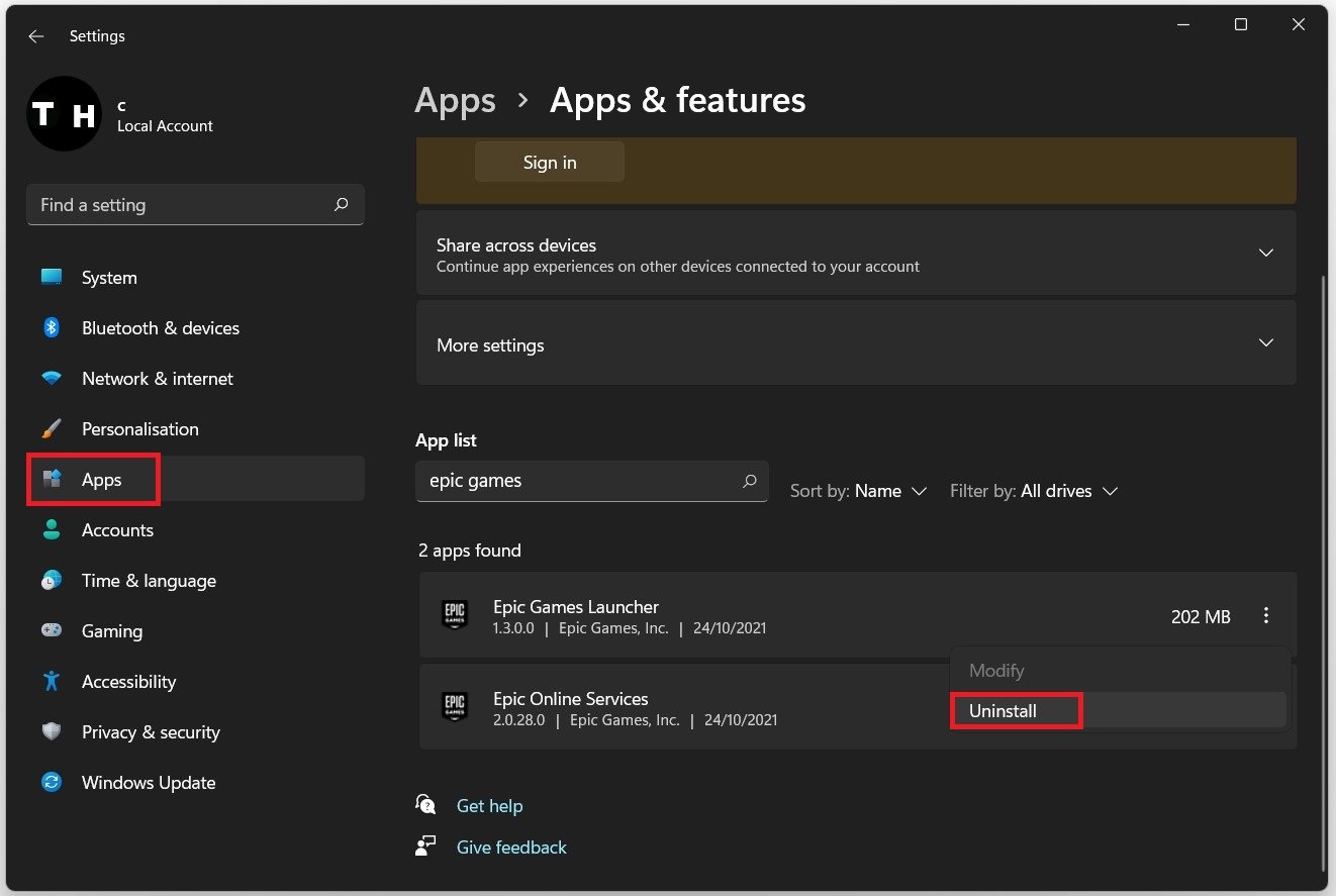 在“应用程序和功能”设置中,使用搜索栏查找 Epic Games。在列表中找到 Epic Games Launcher 后,单击它并选择“卸载”选项。此操作将从您的系统中删除启动器以及任何关联的文件。