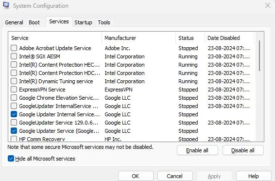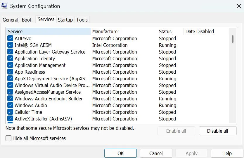 - 选中隐藏所有 Microsoft 服务并单击全部禁用。