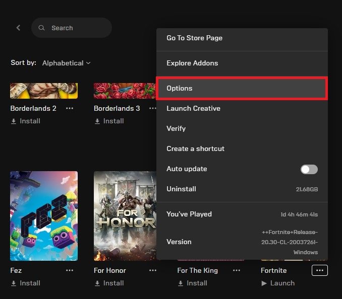 打开您的 Epic Games 启动器并导航至您的游戏库。单击 Fortnite 的汉堡菜单,然后单击选项。