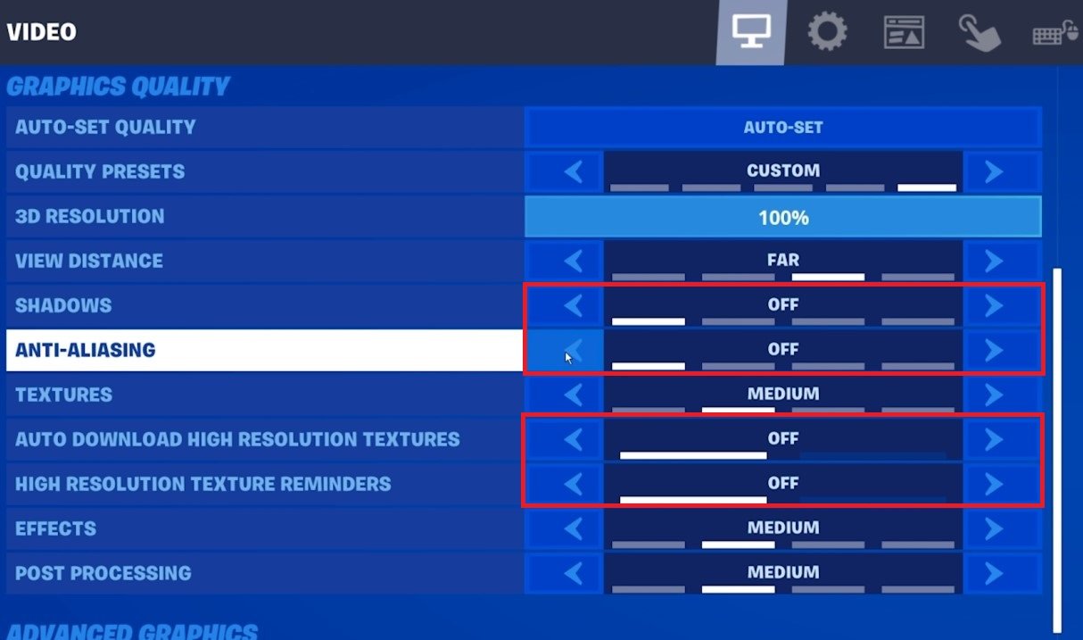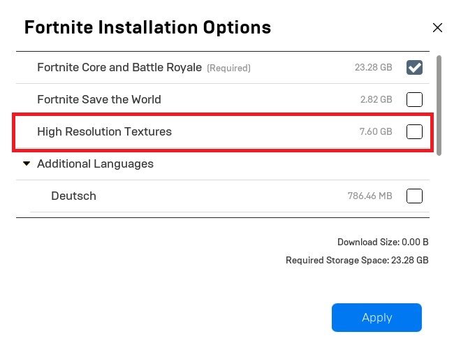 这将允许您禁用高分辨率纹理选项。由于我们在您的视频设置中禁用了高分辨率设置,因此您无需为《堡垒之夜》下载和使用这些设置。