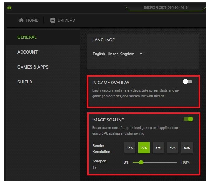 最后,我们将查看您的 GeForce Experience 设置。在一般的部分,确保游戏内叠加已禁用。众所周知,叠加是造成滞后和延迟的罪魁祸首。下面,启用NVIDIA 图像缩放选项。无论如何,这将通过提高游戏的图像清晰度来提高您的游戏性能。它允许您降低视频分辨率,但仍然可以获得出色的视觉体验。