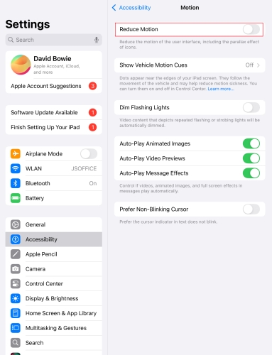 运动效果和高亮度会消耗 iPad 的电池电量来呈现最佳视觉效果。 “辅助功能”下的某些设置(例如“减少动作”和“自动亮度”)可以帮助您节省 iPad 电池。