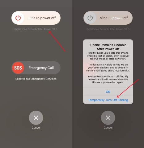 如果您不想看到“iPhone 可查找”消息,您可以在关闭 iPhone 时暂时禁用“查找我的”网络。禁用 iPhone 关机后保持状态的方法是在“滑动到关机”屏幕上执行以下步骤。