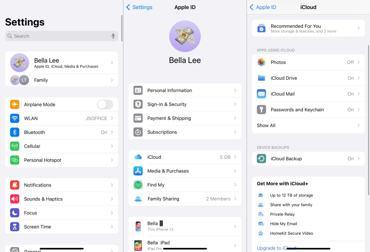 步骤1。前往设置 > 您的 Apple ID 名称 > iCloud。
