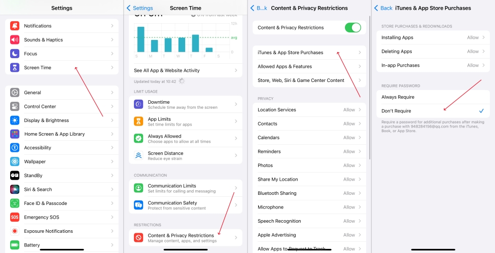 步骤2。轻敲iTunes 和 App Store 购买并选择不要求在需要密码下。