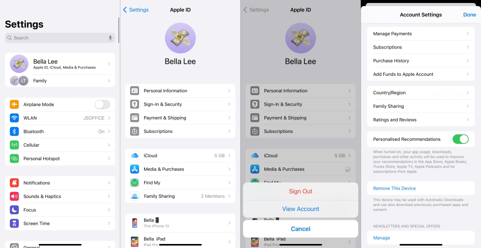 步骤1。前往设置 > 您的 Apple ID 名称 > 媒体和购买。
