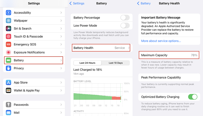 步骤3。如果最大容量始终低于 80%,则需要更换。