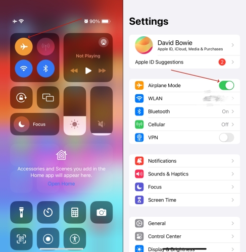 选项 1。前往控制中心并点击飞机图标以启用飞行模式。