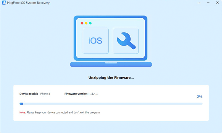 将固件包下载到计算机后,您可以单击“开始标准修复”按钮。 MagFone 软件将解压缩固件并开始修复问题。保持设备与计算机的连接,直到看到“完成”提示。