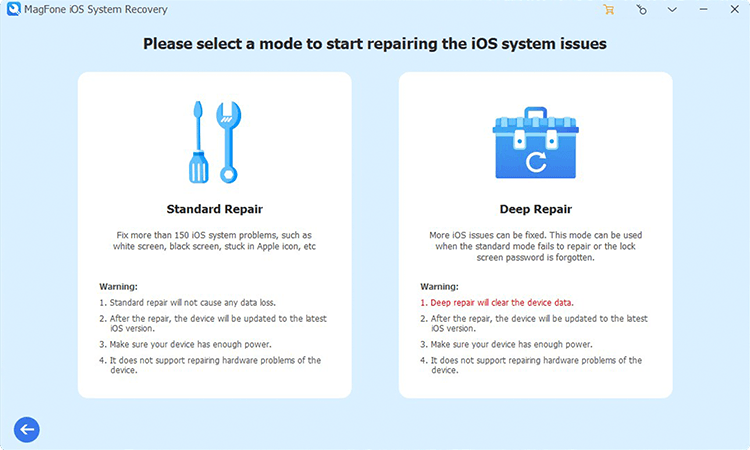 尝试了以上方法后,问题依然没有解决。为什么现在不使用 MagFone iOS 系统恢复? MagFone 软件提供两种修复模式。为避免数据丢失,您可以在标准修复模式下修复问题。该过程很简单,您可以按照以下步骤使用 MagFone 软件解决此问题。