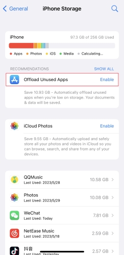 步骤2。在 iPhone 存储下,点击旁边的框卸载未使用的应用程序.