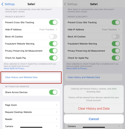 步骤2。在 Safari 下,向下滚动以点按清除历史记录和网站数据.