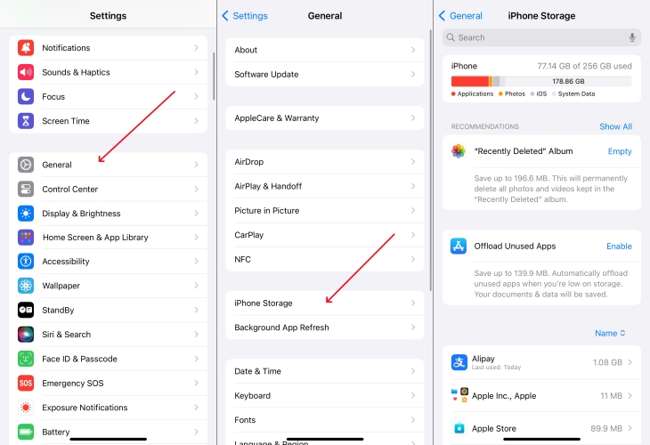 步骤2。选择一般的选项,然后是 iPhone 存储。