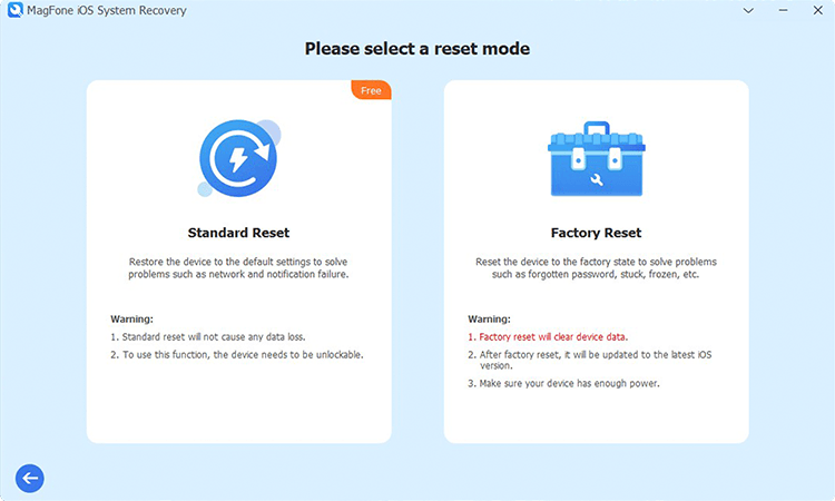 首先将 iPhone 连接到计算机。在计算机上打开 MagFone iOS System Recovery,然后选择“重置设备”选项卡。当屏幕上显示两个重置选项时,选择“出厂重置”可将 iPhone 重置为出厂设置。