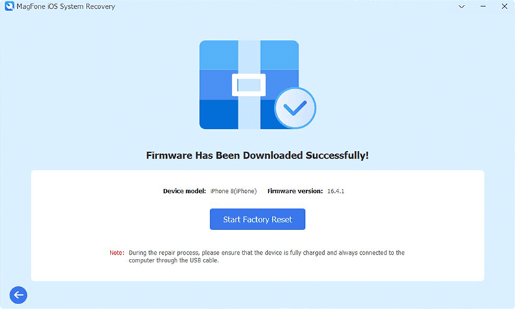 接下来,单击“下载”下载恢复出厂设置过程所需的固件包。确保固件与您的设备型号匹配。然后单击开始恢复出厂设置按钮。 MagFone 将继续执行后续步骤,解决屏幕冻结等问题。