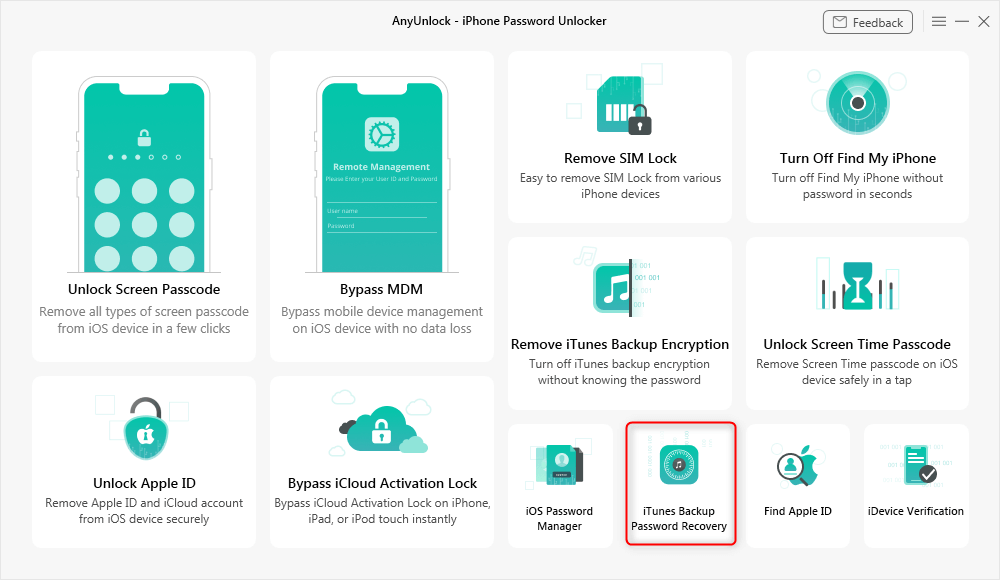 访问 AnyUnlock 中的功能以恢复 iTunes 备份密码