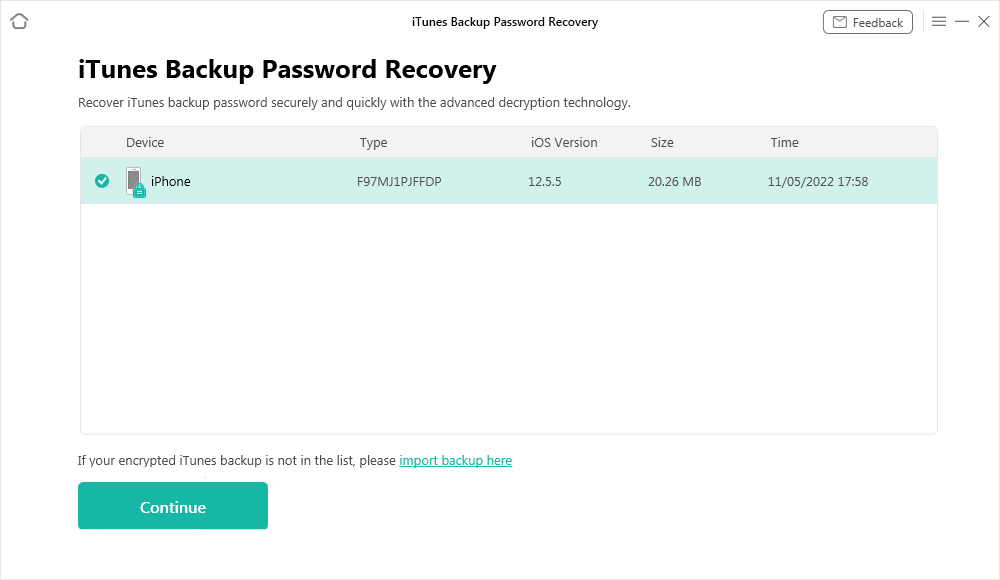 步骤2。在以下屏幕上,从列表中选择一个备份,然后单击继续在底部。如果您的加密备份未列出,请单击导入备份来添加备份。