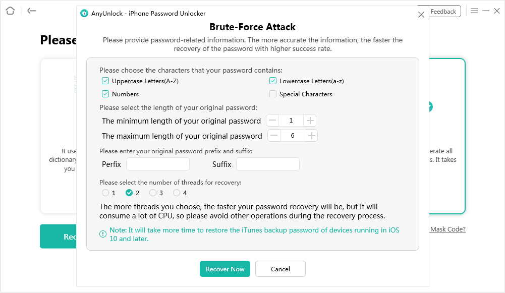 AnyUnlock 使用一组智能算法来查找和恢复 iTunes 备份的密码,并且有一整套在后台运行的进程,试图破解您所选备份的密码。无论你寻求什么恢复您设置或从未设置的iPhone备份密码您可以免费安装AnyUnlock来自行恢复您的密码。