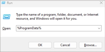 步骤2。在运行窗口中输入%程序数据%框中,然后单击“确定”按钮。