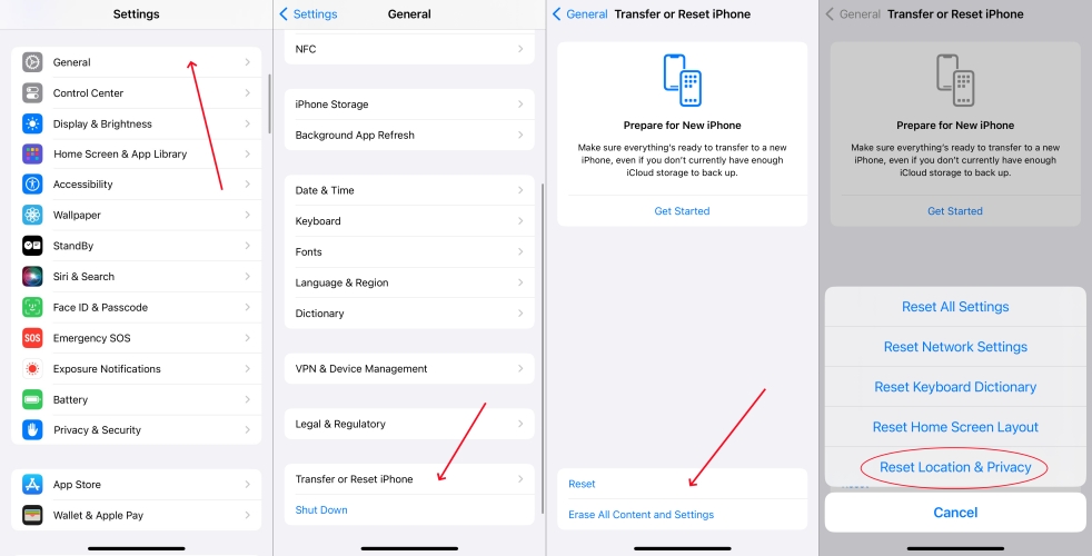 步骤 3.轻敲重置并选择重置位置和隐私。