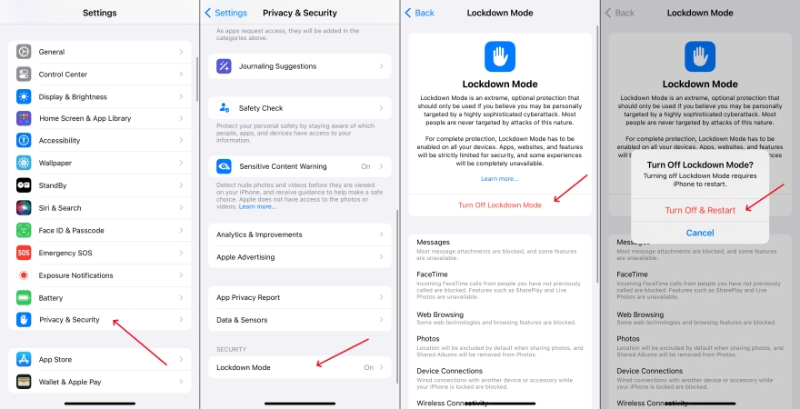 锁定模式是 iOS 16 或更高版本可用的新功能。它有助于保护设备免受极其罕见且高度复杂的网络攻击。如果您已启用它,只需将其关闭即可。