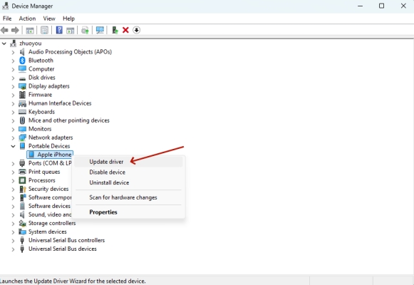 当您遇到错误时,除了重新启动 Apple Mobile Device Service 之外,更新 Apple iPhone 的驱动程序也很重要。此方法可以轻松解决该错误。
