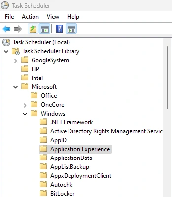 2. 单击任务计划程序窗口左侧面板中的任务计划程序库 > Microsoft > Windows > 应用程序体验。