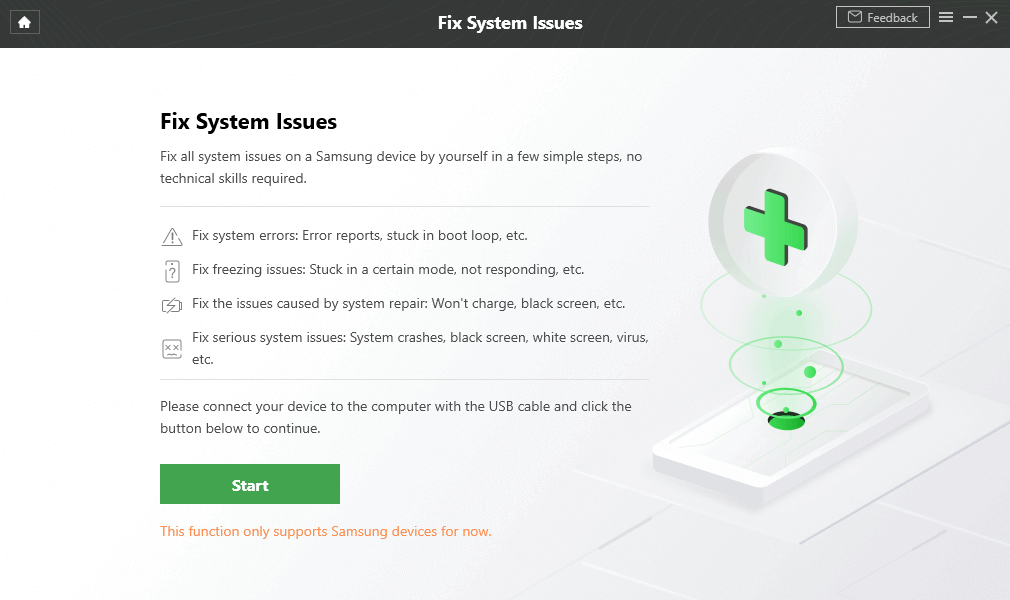 - 该产品有效修复Android系统错误,如启动循环、死机、不识别SIM卡等。