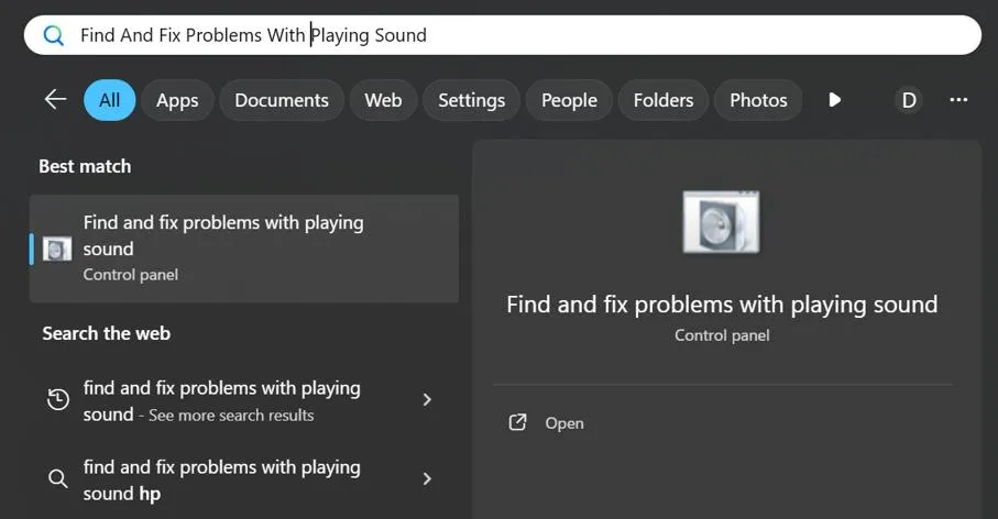 - 按 Windows 键并输入“查找并解决播放声音的问题”。