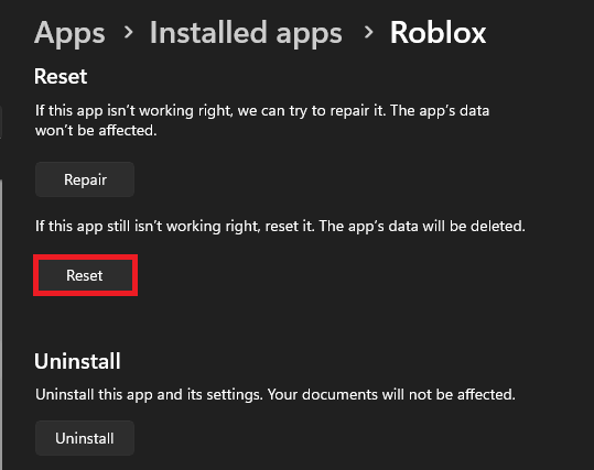 最后,向下滚动并单击重置。这将清除应用程序缓存,就像从 Microsoft Store 重新安装一样。然后,您可以尝试重新启动 Roblox 以验证光标问题是否已解决。