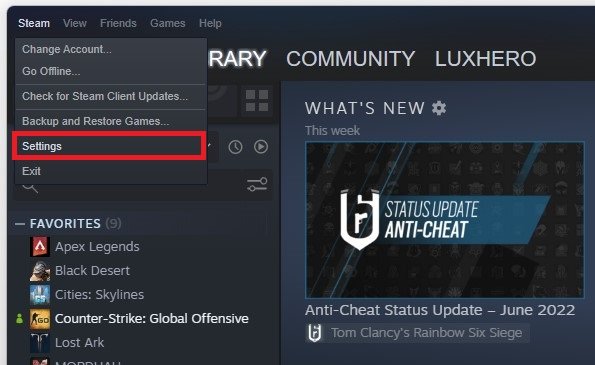 完成后,单击此窗口右上角的 Steam 以访问您的蒸汽设置。