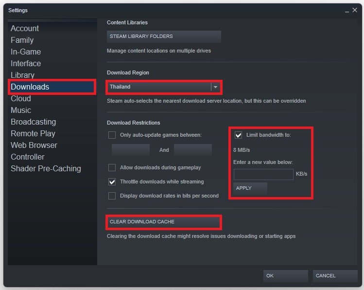 在下载部分,请确保更改您的下载区域到离您很近的服务器。在很多情况下,这已经可以解决您可能遇到的任何 Steam 下载问题。下面,暂时禁用下载的带宽限制,然后单击清除下载缓存这将清除您的缓存并要求您重新登录您的 Steam 帐户。