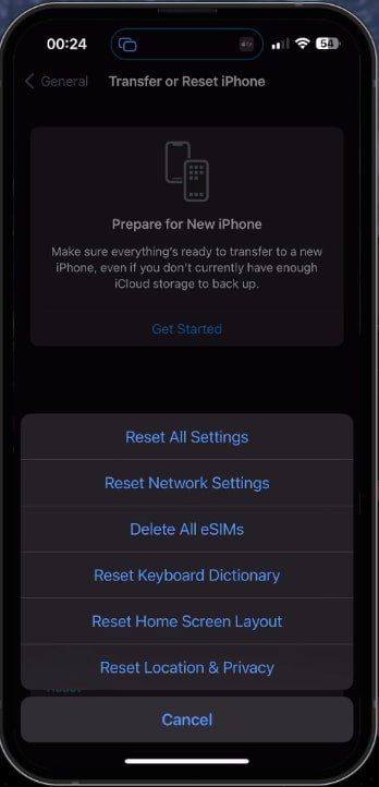 如果问题仍然存在,请考虑重置 iPhone 设置作为潜在的解决方案。为此,请前往设备上的“设置”>“通用”>“传输或重置 iPhone”。点击“重置所有设置”并确认您的选择。请记住,此操作会将所有设置恢复为默认值,但不会删除任何数据或应用程序。如果在尝试所有这些步骤后,点击唤醒功能仍然无法运行,则可能表明您的 iPhone 存在硬件问题。