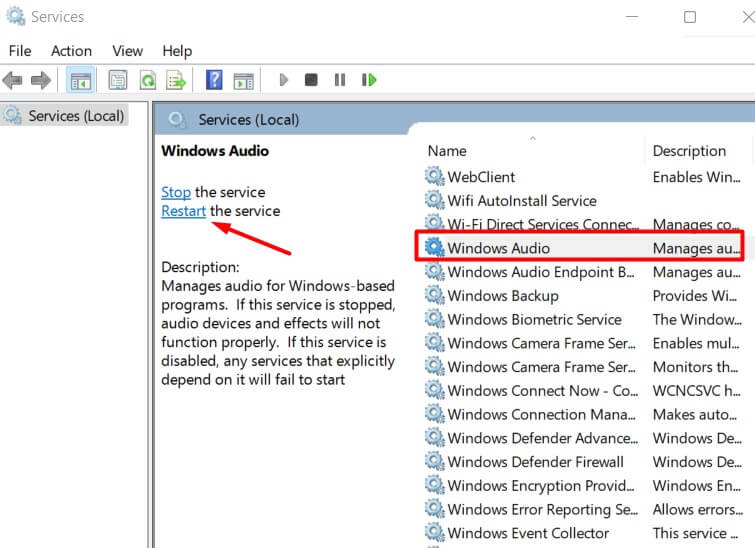 另一个有效的措施是重新加载音频服务。由于音频服务会调节其他Windows音频,因此有时会再次启动它,将有助于消除问题。