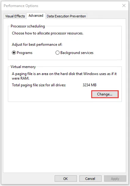 5.将进一步打开一个新的盒子。单击“高级”选项卡,然后单击“更改”。