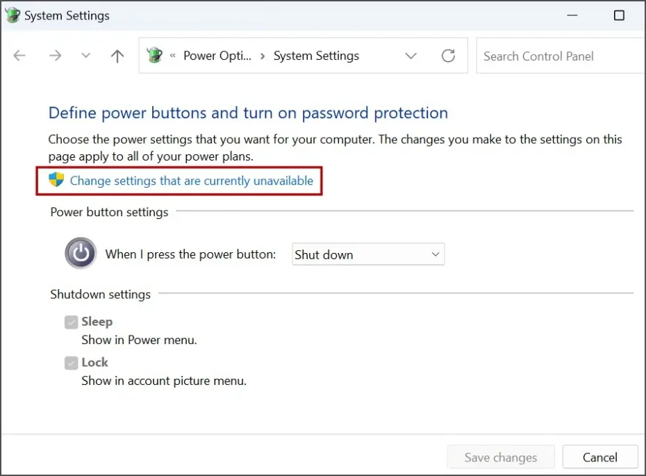 步骤 4:将打开一个新框,您必须在其中单击“更改当前不可用的设置”链接。