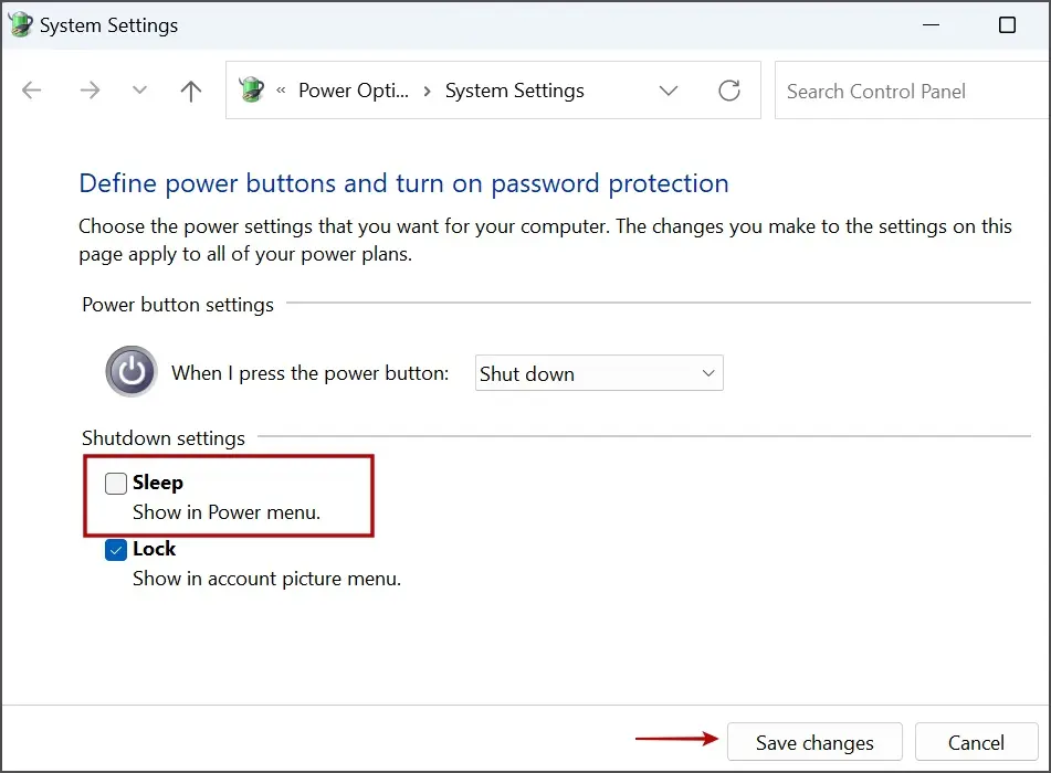 步骤 5:取消选中“睡眠”旁边的复选框,然后单击右下角的“保存更改”按钮。