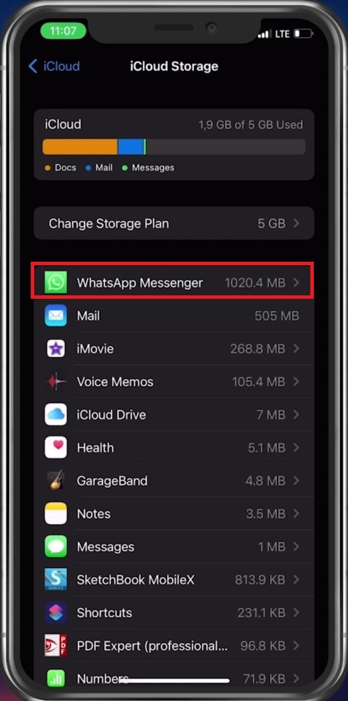 如果已启用,请点击管理存储。在此应用程序列表中,找到 WhatsApp Messenger,您可以看到 WhatsApp 数据在 iCloud 中占用了多少存储空间。如果您觉得没有足够的存储空间来备份 WhatsApp 数据,请考虑禁用一些占用大量存储空间的应用程序。