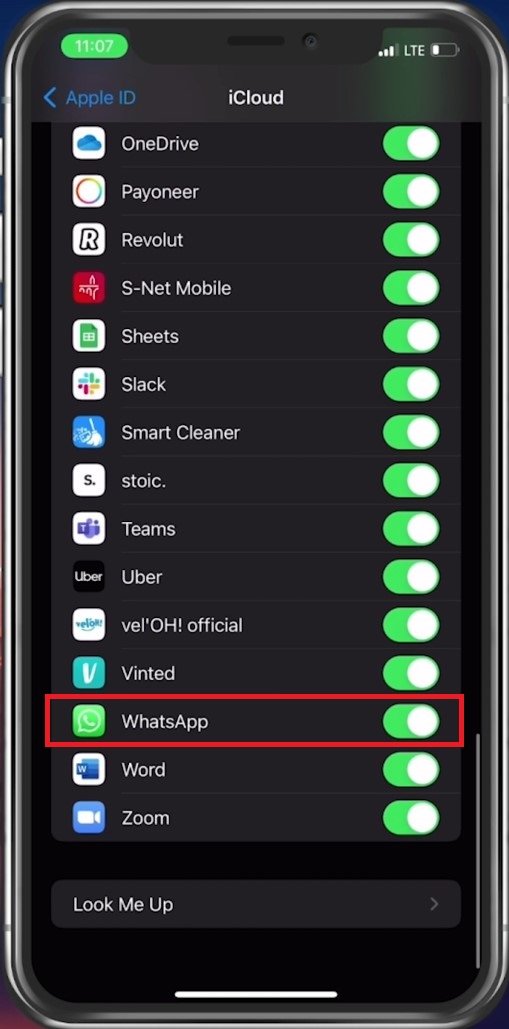 确保您的 iPhone 连接到可靠的 WiFi 或蜂窝网络,然后打开您的设置应用程序。在这里,点击您的 Apple ID 名称并选择iCloud。在您的 iCloud 设置中,确保 WhatsApp 已启用。