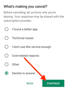 - 将出现一个弹出菜单,提示取消原因。您可以选择“成本相关原因,”或者你可以“拒绝回答,”就像我一样。点击“继续”。