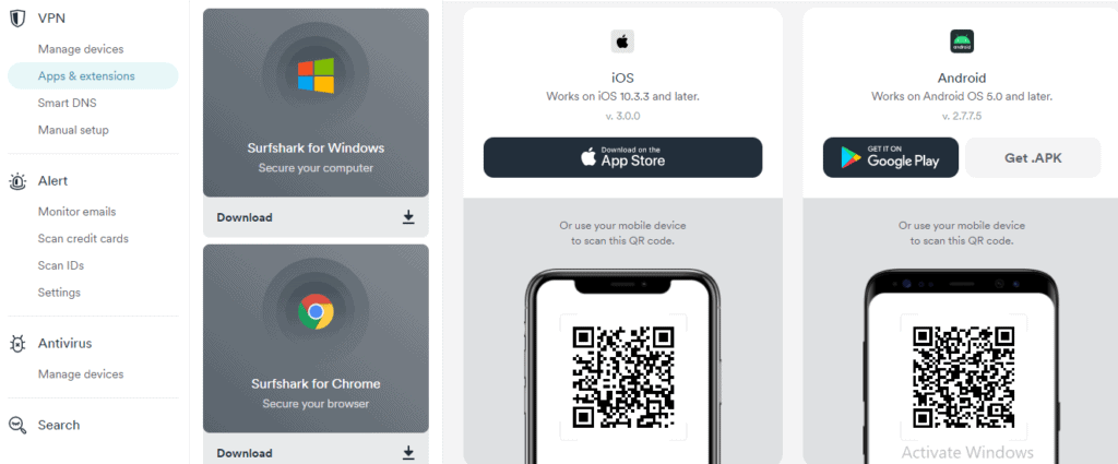 - 如果您使用的是 Windows、Linux 或 macOS,则可以通过您的帐户下载适用的 Surfshark 软件。如果您使用的是智能手机或平板电脑,则可以从 Google Play 或 Apple Store 下载该应用程序。