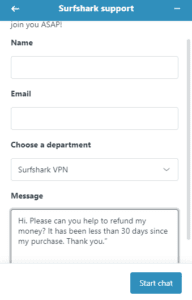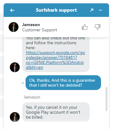 我仍然想确认我的卡上没有钱被扣除,所以我使用了 Surfshark 的实时聊天安慰。