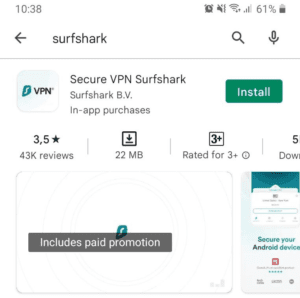- 浏览建议,直到找到官方 Surfshark 应用程序。它看起来像这样: