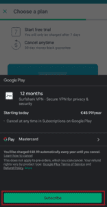 - 现在,您将被引导至输入卡详细信息的页面。完成后,单击“订阅”。您将自动获得一年期优惠,不过您可以稍后在 Apple 或 Play 商店设置中进行更改。