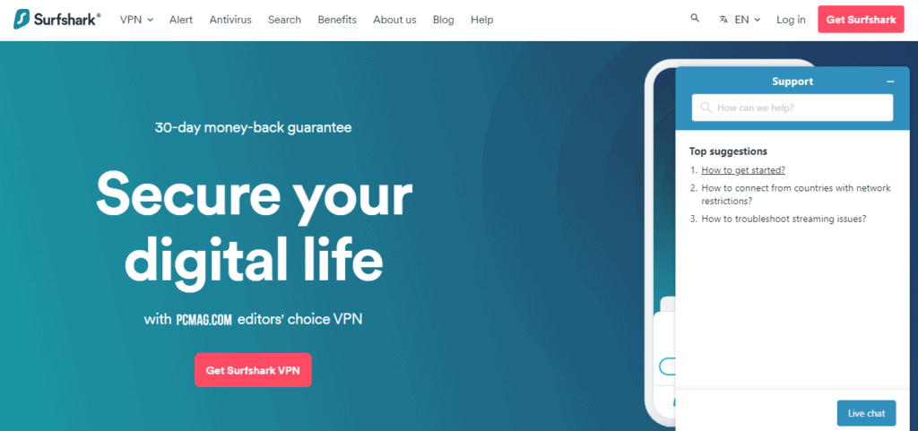 - 前往 Surfshark 网站并单击“支持”按钮位于右下角。这将打开一个“实时聊天“ 盒子。